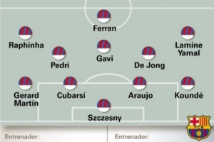 巴萨首发:什琴斯尼;杰拉德-马丁、库巴西、阿劳霍、孔德;佩德里、加维、德容;拉菲尼亚、费兰、亚马尔